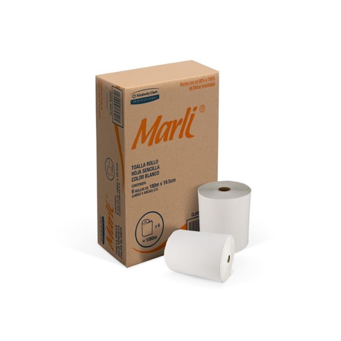 Toalla en Rollo Marli caja con 6 rollos de 180mts cada uno color Blanco hoja Sencilla ancho 19.5cm